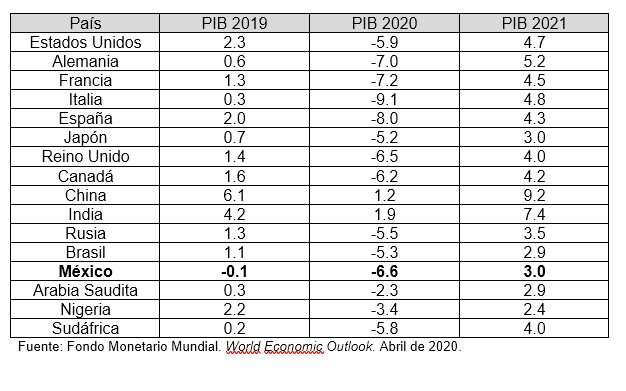 Frente a estos datos los indicadores para México no son tan halagüeños; ya que en 2019 el PIB nacional tuvo un retroceso de -0.1%; mientras que en 2020 la caída podrá llegar a ser de -6.6%; una de las más altas en las economías emergentes y en desarrollo. Para 2021 la previsión de crecimiento sería de 3%; indicador bajo que no alcanzaría a compensar los retrocesos de 2019 y 2020; y que de cumplirse estos pronósticos, el PIB mexicano de 2021 sería el equivalente al 96.16% del logrado en 2018. En los tres casos los promedios de México son inferiores a la media internacional; además de ser el único país que tiene dos años de decrementos consecutivos de acuerdo con la tabla de países seleccionados.