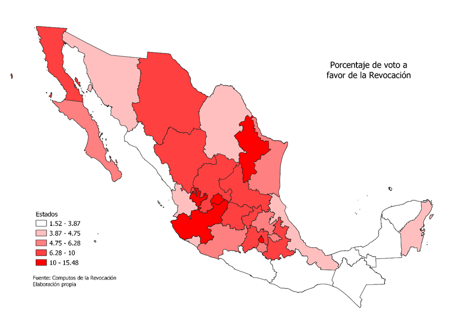 Los estados que más votaron a favor de que se revocara el mandato fueron Nuevo León con 15%, Jalisco con 11%, Aguascalientes con 10.87% y Ciudad de México con 10.36%. El voto por la revocación fue bajo en general, pero donde existió mayor votación en porcentaje para revocar en distritos de estos estados fueron los correspondientes: Distrito 15 de la CDMX en la alcaldía Benito Juárez con 17.35% de las votaciones a favor de que se revocara. En los Distritos 10,8,3 de Jalisco, en las zonas populares del Oriente de Guadalajara se votó por revocar hasta con un 26%, en el caso del distrito 10 correspondiente a la Zona de Tetlán, en el Distrito 3 un 22% y en el distrito 8 se votó un 20% . Por el Lado de Nuevo León, los Distritos 1 y 6, correspondientes a Garza García y Monterrey, se votó para revocar en un 28% y 27%.